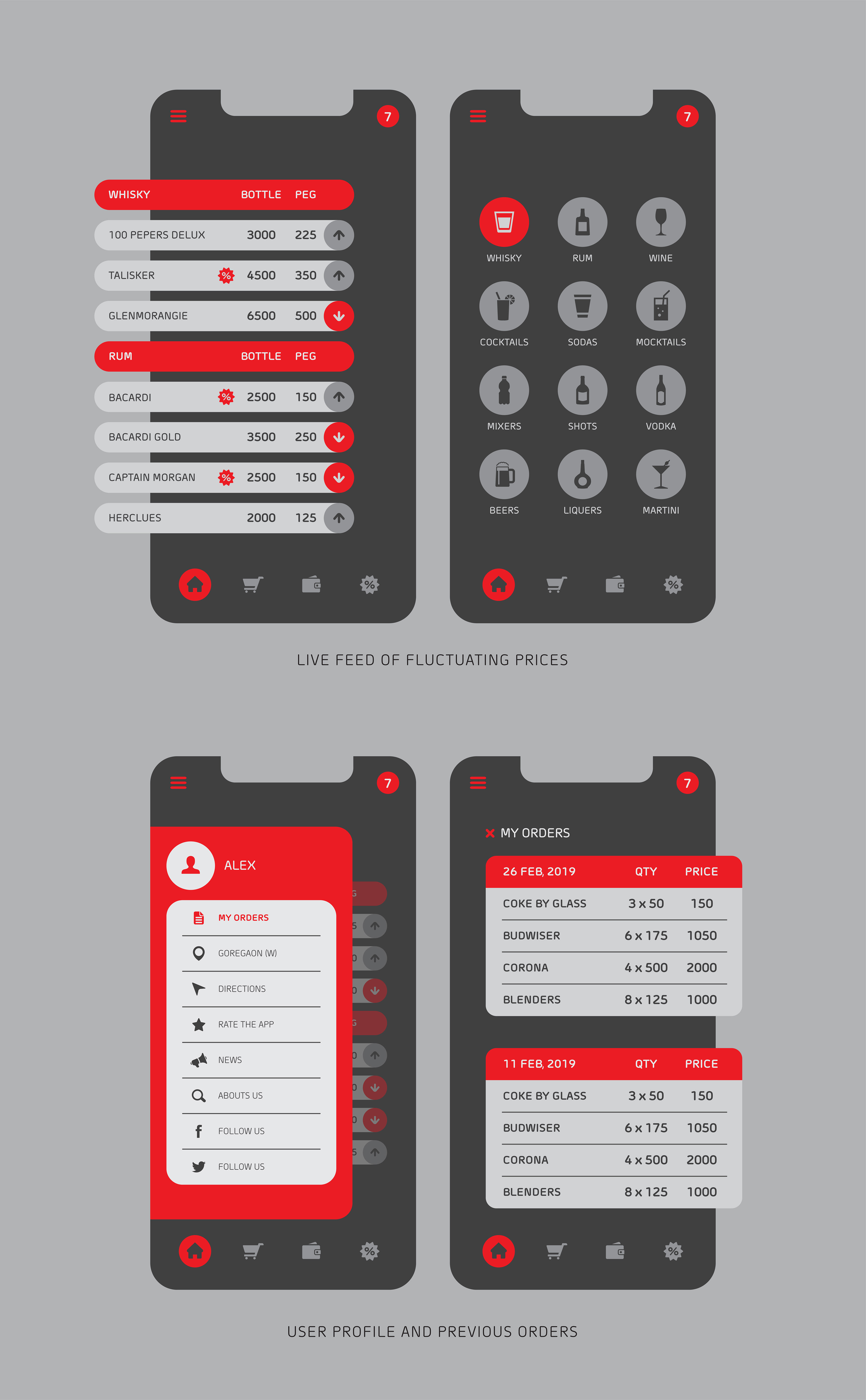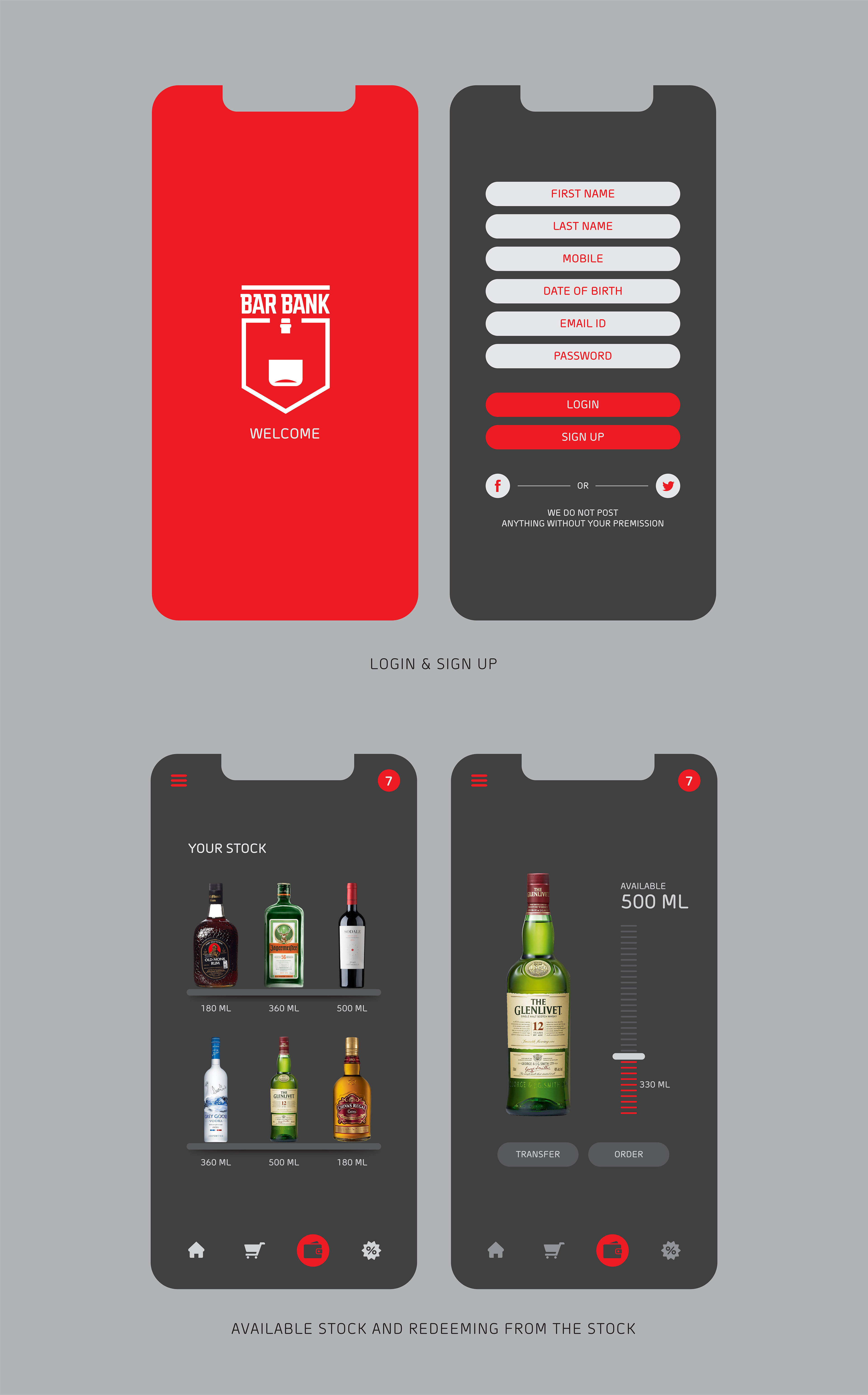 Branding and app interface design for a concept lounge that allows consumers to buy booze by bottles and store the reserve with them, which can be redeemed later at any of their outlets.