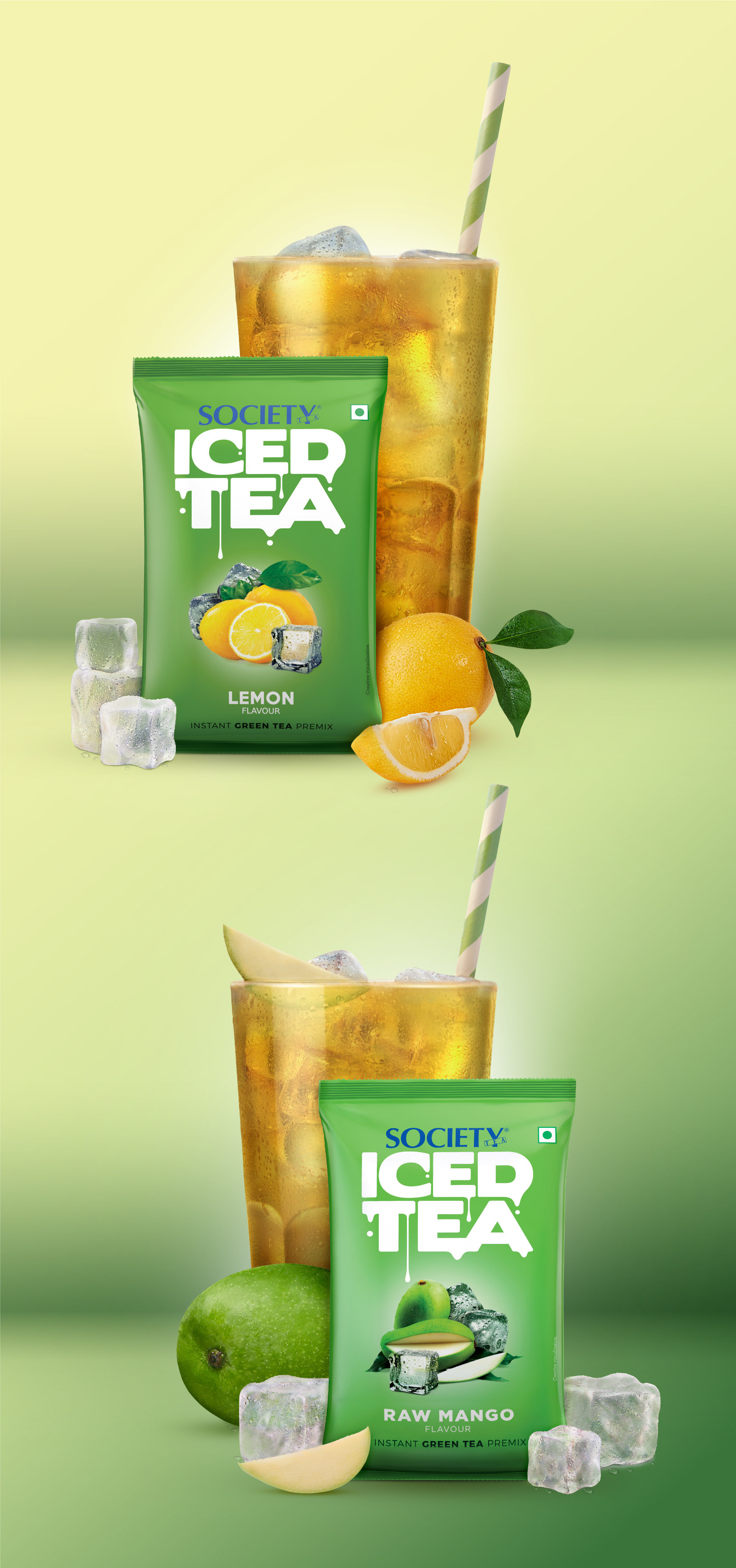 Branding and packaging design for Society Instant Iced Tea Premixes. The typography captures the feeling of melting ice to visually depict the nature of the product. The colour palette is carefully picked to differentiate between the black and green teas. Agency : Black Swan Life Photographer : Mihir Hardikar Stylist : Swati Desai