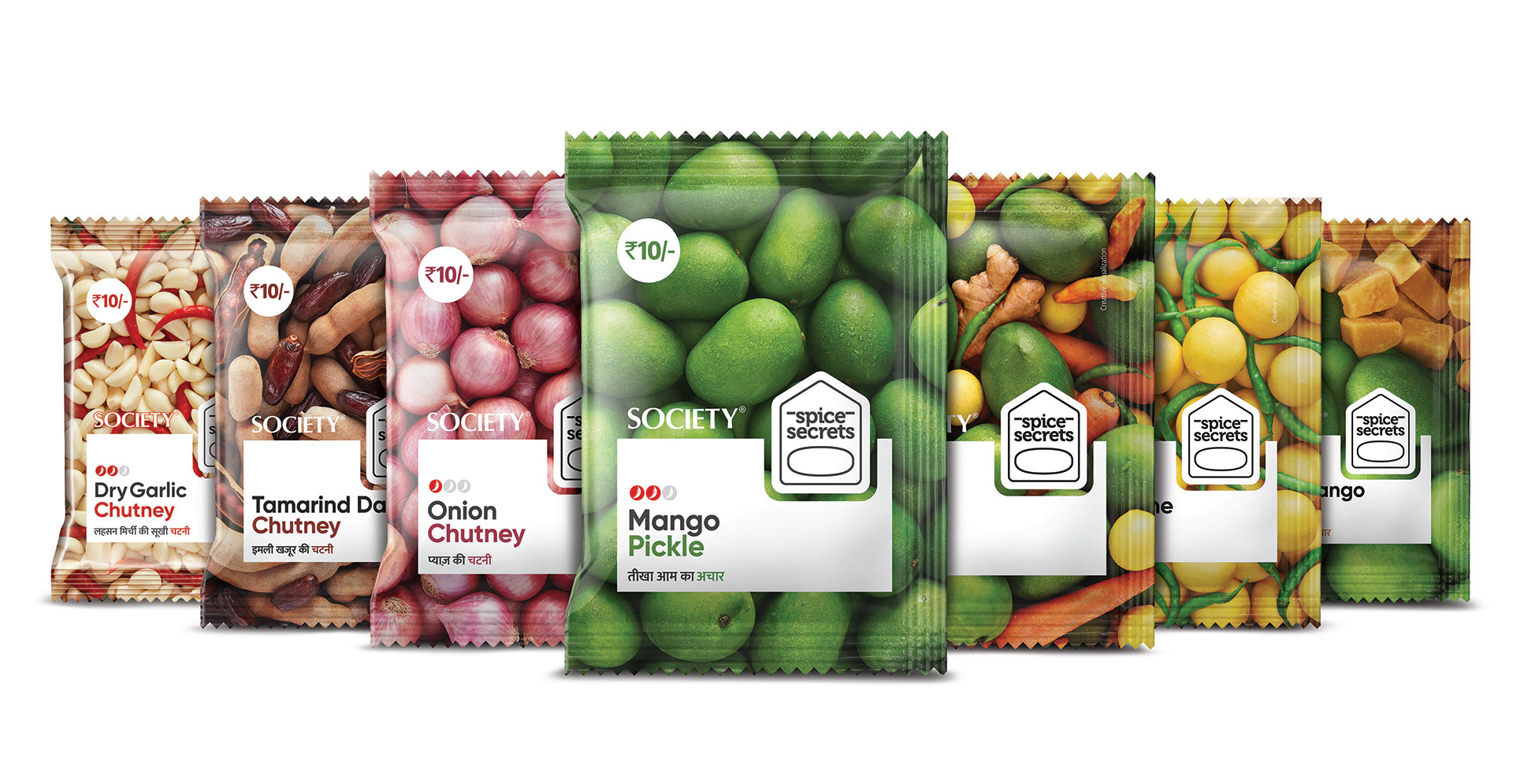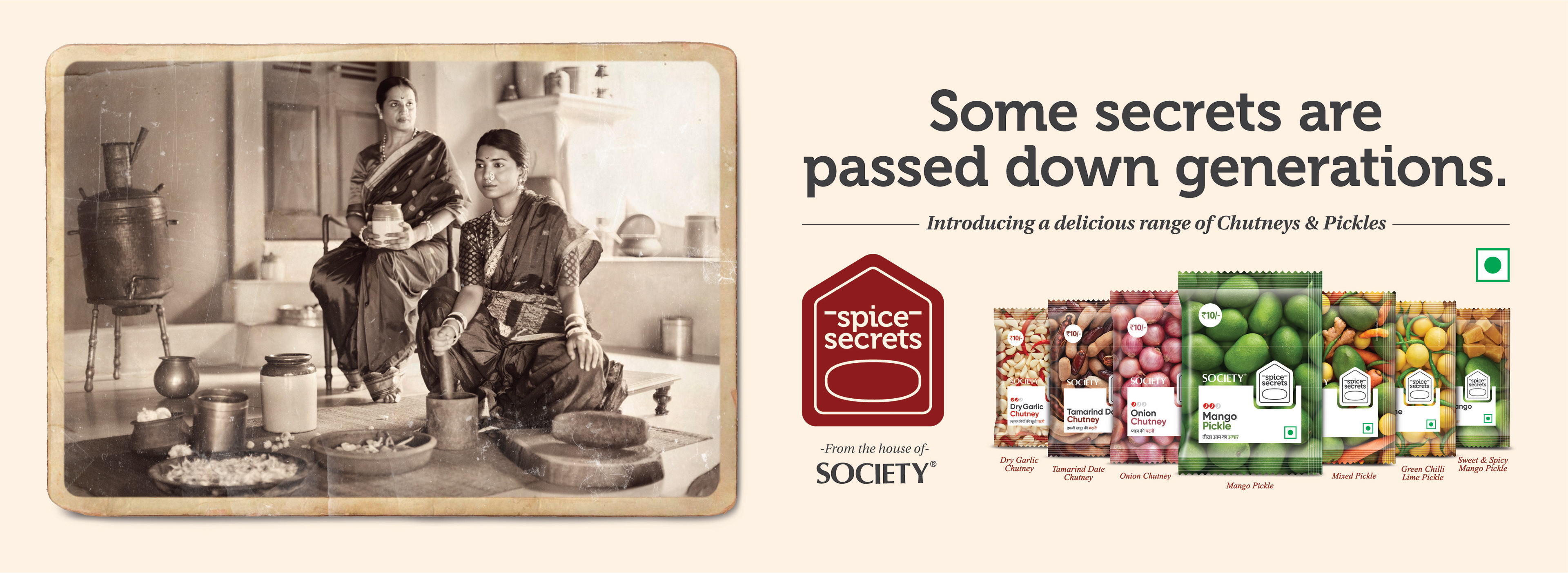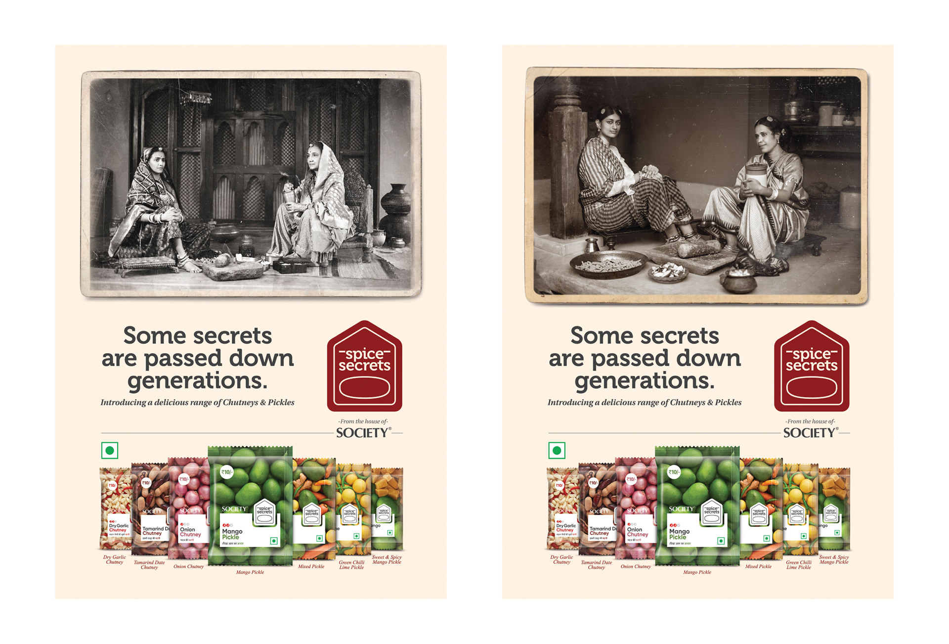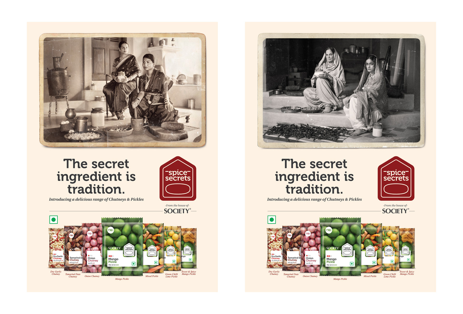 A branding and design project for Society Tea in collaboration with Black Swan Life. They were coming up with a range of pickles and chutneys. In a space that was already cluttered and is ruled by the giants like Priya, Mother's Recipe, Bedekar, Pravin, MTR, etc., we chose to narrate a story of how the recipes were passed down from the older generations to the younger ones in the kitchens, over a stone grinder, or while cooking. This was a story of how we are unveiling those non-documented secrets for everyone.