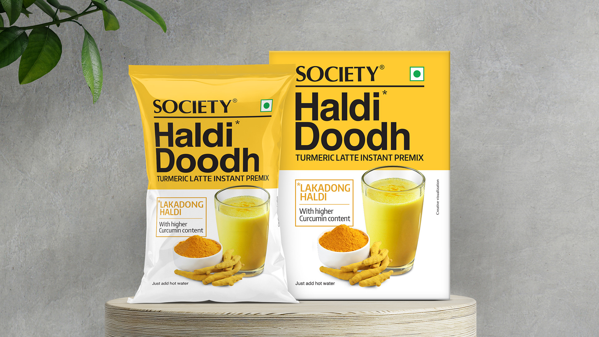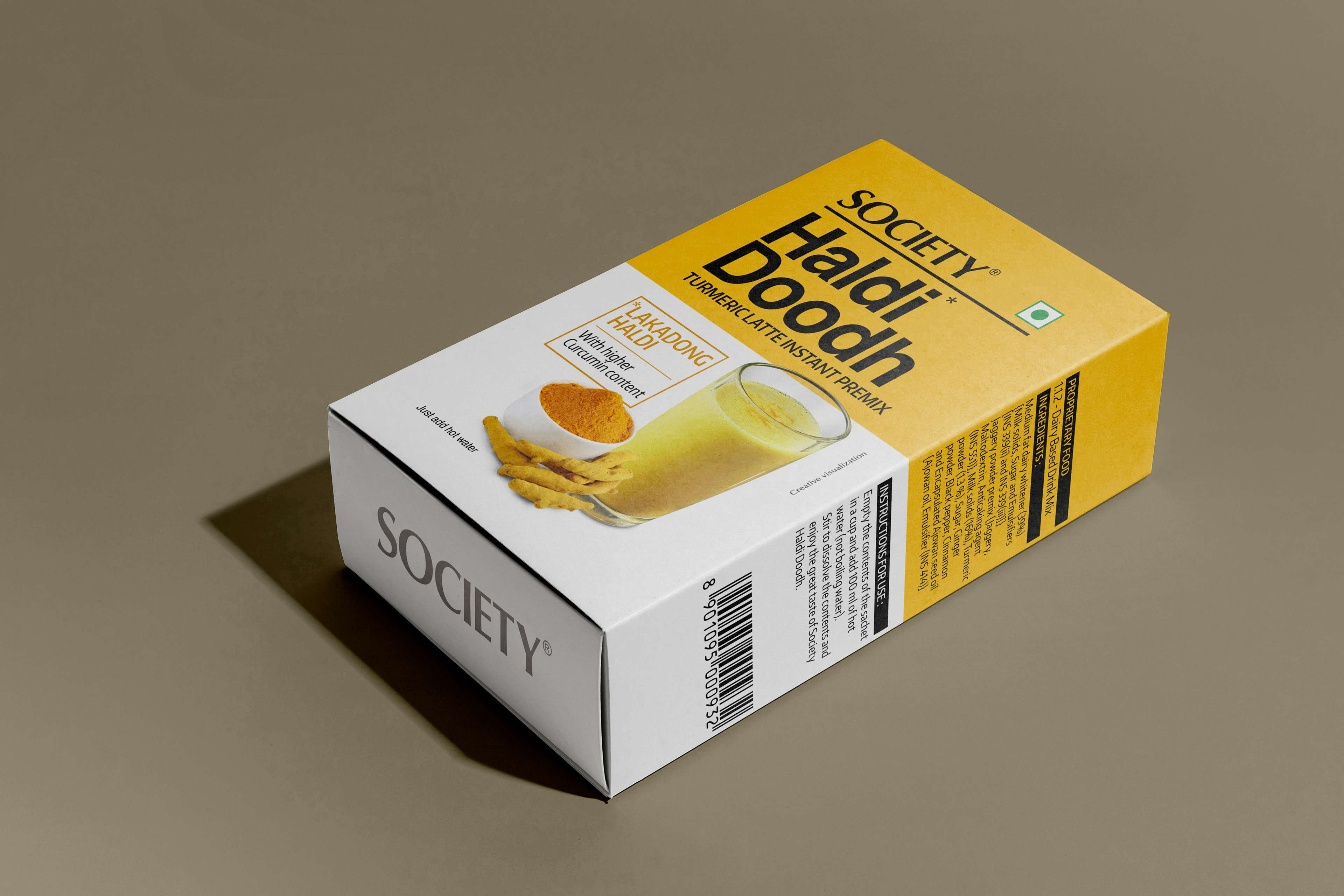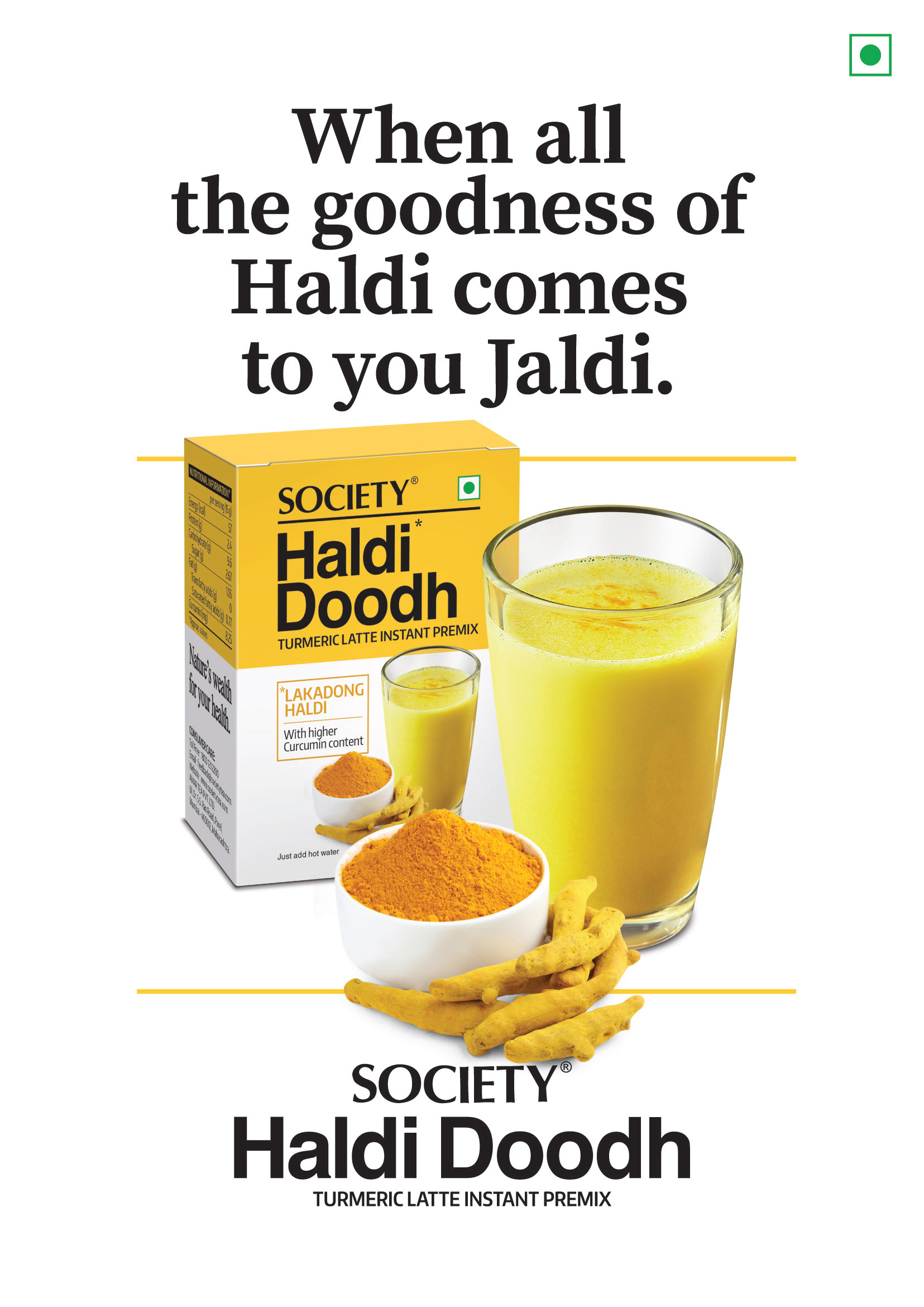 Packaging and communication design for Society Haldi Doodh